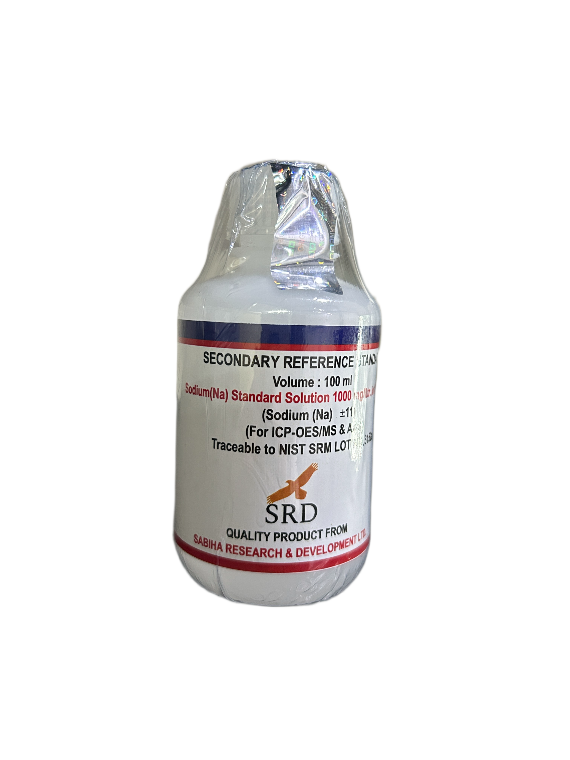 Sodium Standard Solution (1000 mg/L) is a Certified Secondary Reference Standard, NIST traceable, intended for instrument calibration and quantitative elemental analysis. The solution is prepared in a 5% nitric acid (HNO₃) matrix under controlled conditions and supplied with a batch-specific Certificate of Analysis (COA) indicating certified concentration, traceability, and measurement uncertainty.